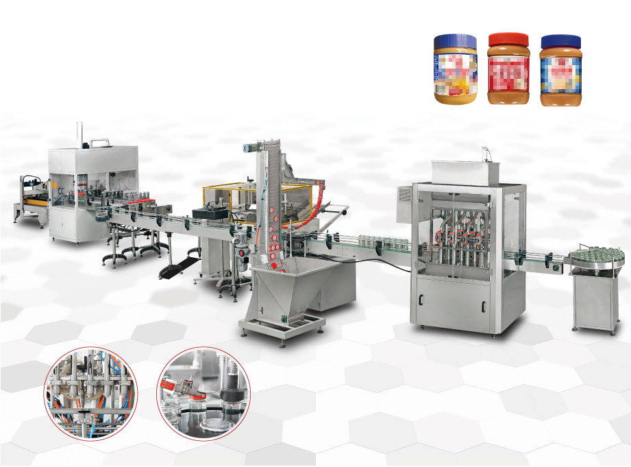 该花生酱灌装生产线是我公司借鉴国外先进技术,自行研制开发的新一代灌装机。该机采用活塞计量,集机电、气动于一体,由PLC控制,结构紧凑,设计合理,具有灌装精确,运行稳定可靠、工作效率高、寿命长等特点。花生酱灌装机广泛适用于花生酱、芝麻酱、麻酱等产品灌装,有多种灌装量可供选择。花生酱灌装机可与洗瓶机、隧道灭菌烘箱、旋盖机、贴标机等设备组成生产流水线。